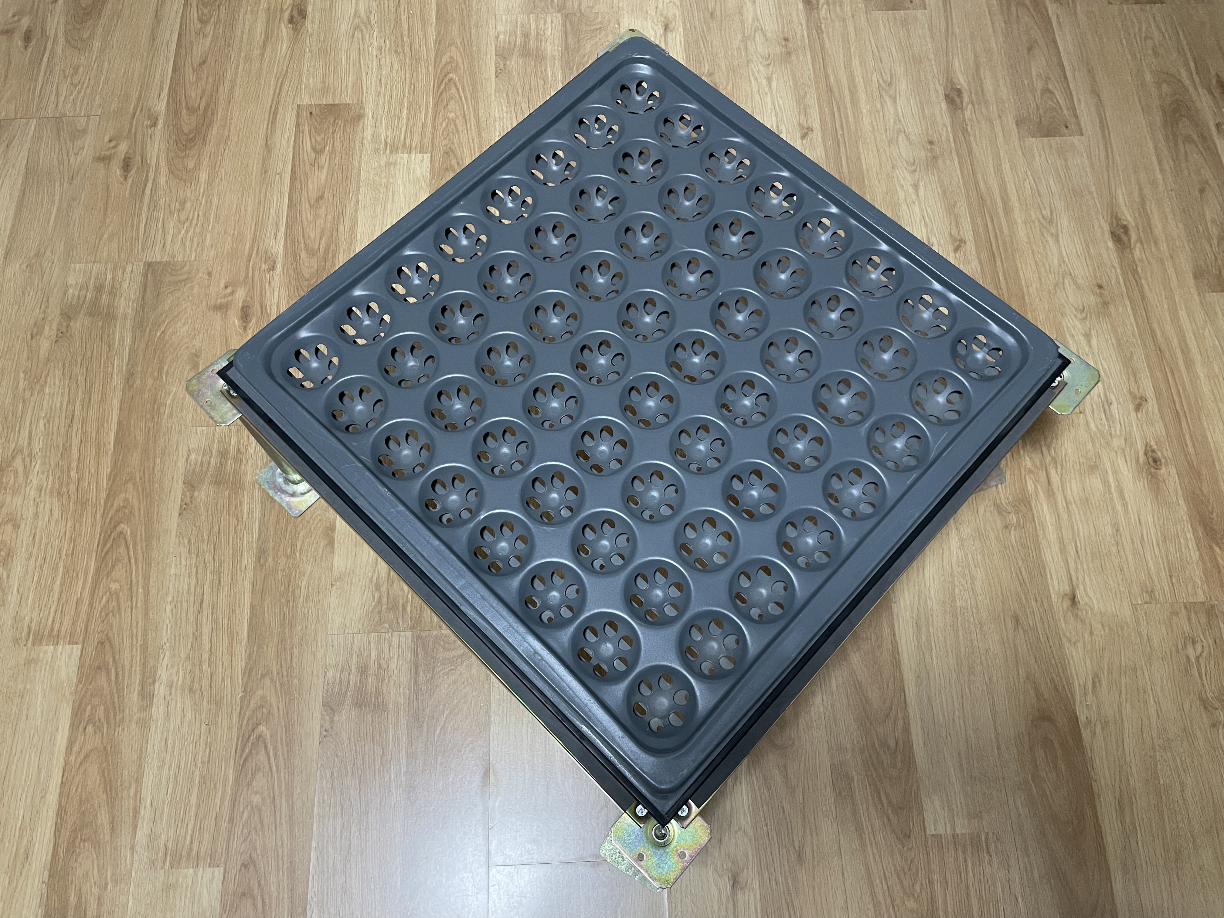 全鋼蜂窩通風(fēng)地板的主體為全鋼結(jié)構(gòu),地板內(nèi)腔是空心的,背面為蜂窩狀結(jié)構(gòu),地板表面帶有通風(fēng)孔并粘貼 HPL 防靜電貼面或 PVC 防靜電貼面,四周鑲嵌導(dǎo)電邊條(或無)。